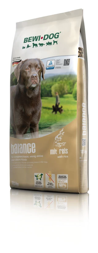 Ihr Hund bewegt sich wenig, ist schon älter oder hat ein bisschen viel Gewicht auf den Rippen? Dann empfiehlt sich das energiereduzierte BEWI DOG® balance mit leicht verträglichem Reis und geringem Fettgehalt.
